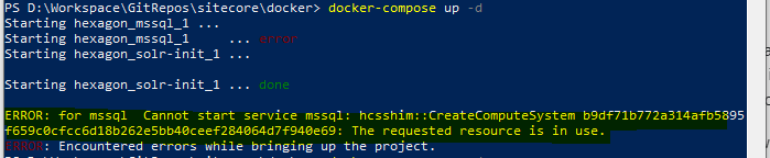ERROR: for xxxxxx Cannot start service xxxxxx: hcsshim: :CreateComputeSystem xxxxxxxxxxxxxxxxxxxxxxxxxxxxxxxx. The requested resource is in use.. You may see this error when trying to bring up the containers as shown below.